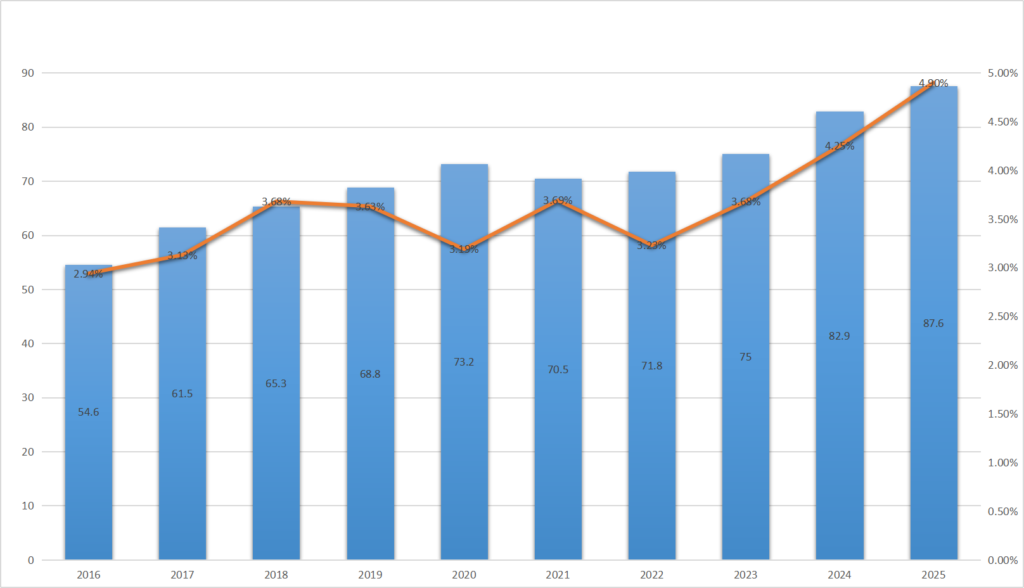 2016年から2025年にかけて、分配金は54.6円から87.6円になり、約1.6倍にまで膨らんでいます。途中、コロナ禍の影響を受けた時期もありましたが、10年というスパンで見れば、基本的には「右肩上がり」の推移を辿っていることがわかります。