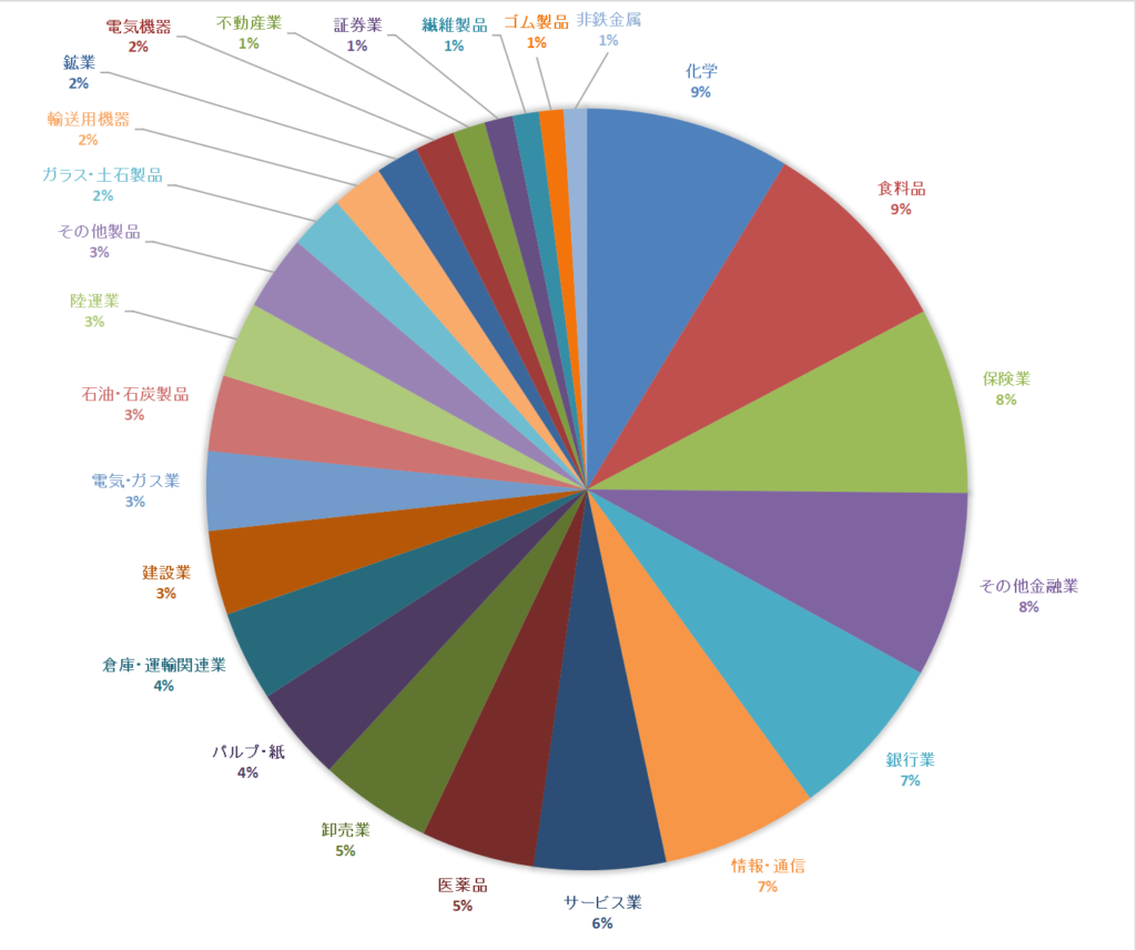 業種別の受取配当金の割合は以下のグラフの通りです。特定の業種に偏らないように銘柄を選定しているつもりです。