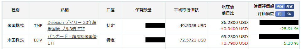 私が保有している米国債券ETFのEDV(超長期債)、3倍ブルのTMF。どちらの銘柄も含み損の状態です。