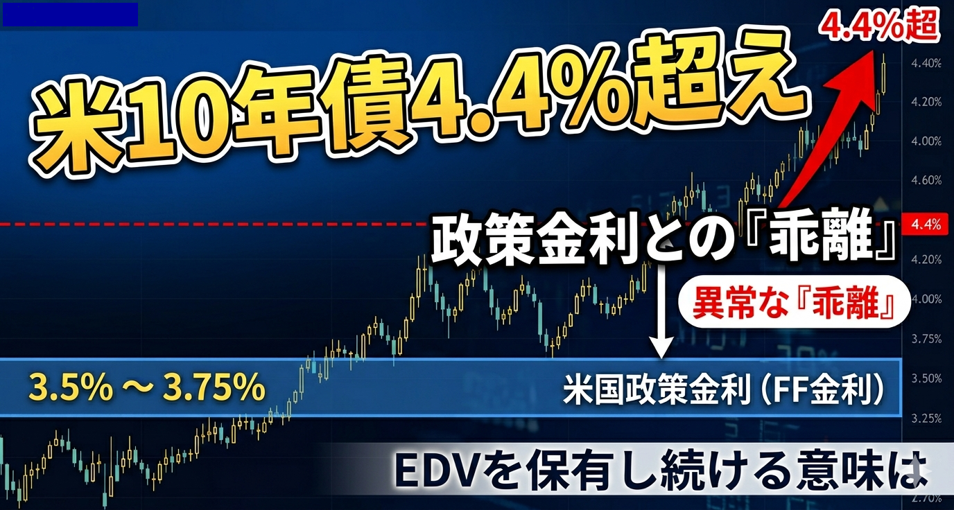 最近、米国の政策金利は3.5~3.75%です。にもかかわらず、長期金利(10年債利回り)は一時4.4%を超えるような場面もあり、政策金利とは大きく乖離しています。債券ホルダーにとっては非常に厳しい局面になっています。