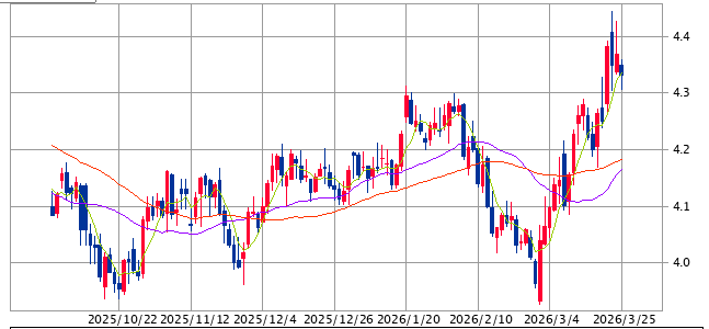 現在の米国の政策金利は3.5〜3.75%程度。通常であれば、長期金利はこの水準に収束するか、将来の利下げを織り込んで低く推移するはずです。しかし、実際には長期金利が先行して上昇し、政策金利との「乖離」が広がっています。