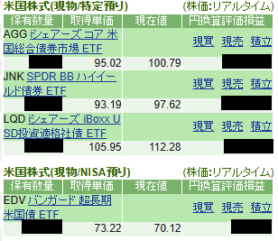 私は米国債券ETFの「AGG」「JNK」「LQD」「EDV」「TMF」の各ETFを所有しています。取得単価と現在値は以下のスクリーンショットの通りなのですが、「EDV」と「TMF」以外の銘柄はドルベースで含み益の状態になっています。