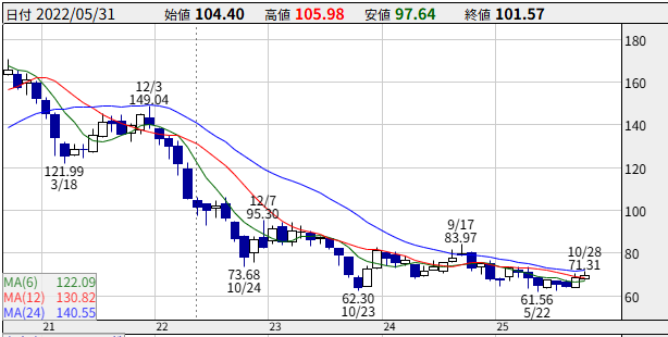 そして2022年5月頃の「EDV」の価格を見ると、100ドル前後になっています。