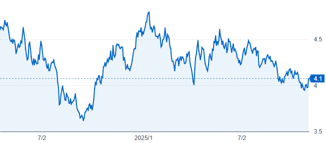 今年に入ってからの各米国債券ETFの値動きは、米国長期金利の低下に伴い上昇していました。米国の長期金利は今年1月には4.7%程度であったものが、最近は4%を切るような場面もあり、現在は4.1%程度となっています。