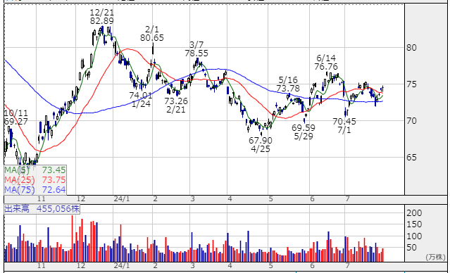 私の購入した価格は75.78ドルですので、このチャートから見て決して安値では購入できていないと思います。購入するタイミング難しいですよね。キャピタルゲインを狙って買っているわけではないのでまぁ良いかなぁとは思いますけど。。