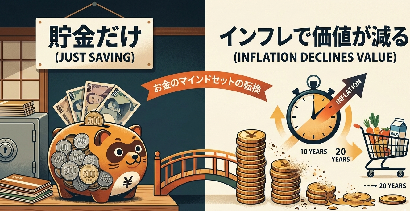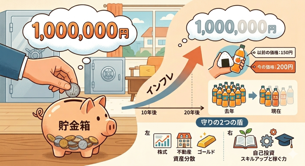 今でも多くの日本人は「投資は元本が減るリスクがあるから怖い。貯金が一番安全だ」と考えがちです。しかし、インフレが進む局面では、「何もしないこと(貯金だけすること)」が最大のリスクになります。