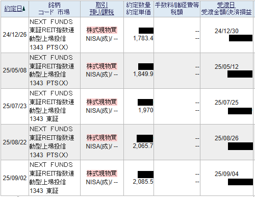 下記のスクリーンショットは、昨年末から今年9月までの東証ETF1343の取引履歴の抜粋です。