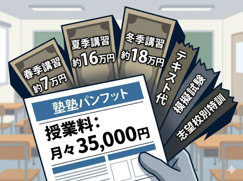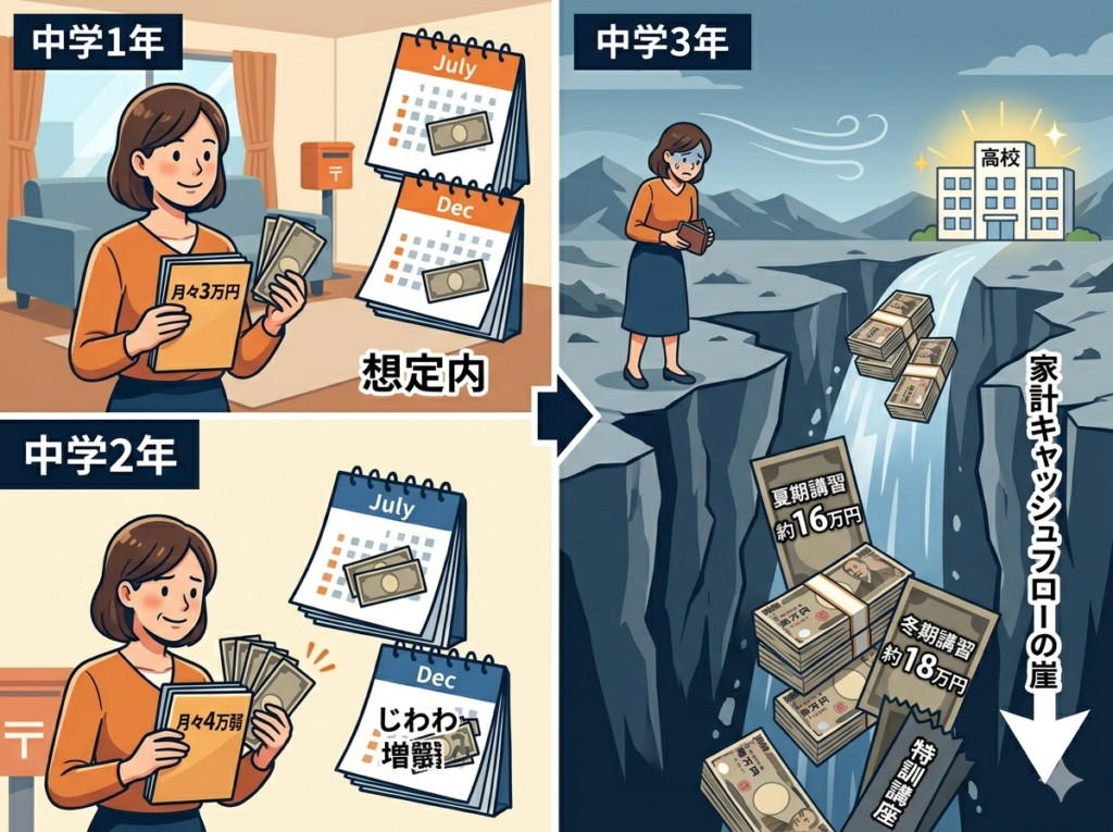 - 中1・中2の授業料(3〜4万円)を見て安心していると、中3の夏・冬に訪れる「15万円〜20万円の支出」で家計のキャッシュフローが止まる恐れがあります。3年生は年間で約100万円の予算を確保しておく必要があります。