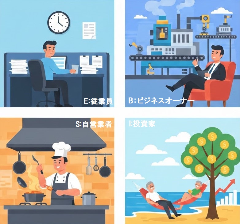 「ESBI」とは、世界的なベストセラー『金持ち父さん 貧乏父さん』の著者、ロバート・キヨサキ氏が提唱した、収入を得るための4つのクワドラント(領域)です。世の中のすべての働く人は、必ずこの4つのどこかに属しています。