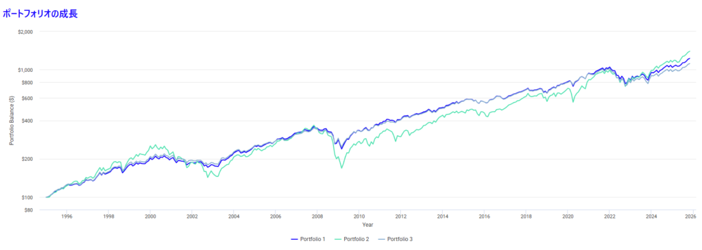 ポートフォリオビジュアライザーのバックテスト機能を使って、1995年~2025年までの約30年間で簡単なシミュレーションをしてみました。