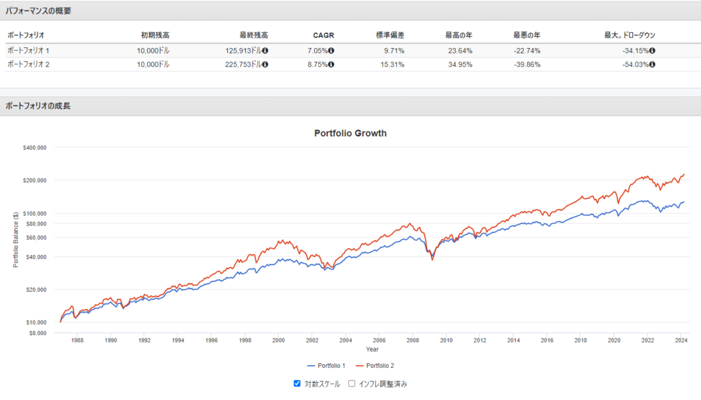 下の画像はポートフォリオビジュアライザーというサイトでバックテスト?をしてみた結果です。過去40年程度の市場のデータから年率リターンや資産の推移などをシミュレーションしました。